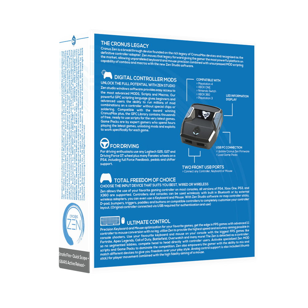 [vc_row][vc_column][vc_column_text]   Cronus Zen is a breakthrough device founded on the rich legacy of the award-winning CronusMAX devices, universally recognized as the definitive controller adapter. Zen moves that legacy forward,...